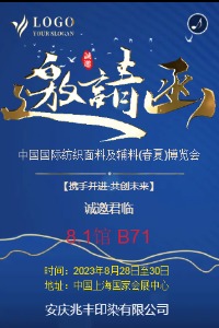 2023年8月28日至30日,中国上海国家会展中心,8.1馆B71安庆兆丰印染有限公司,欢迎新老客户的光临!